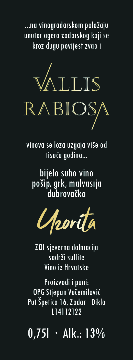 Brend najboljih sorti Dalmacije: Malvasija Dubrovačka, Maraština, Pošip i Grk, 13% alkohola i 6,5 g/l kiselina.